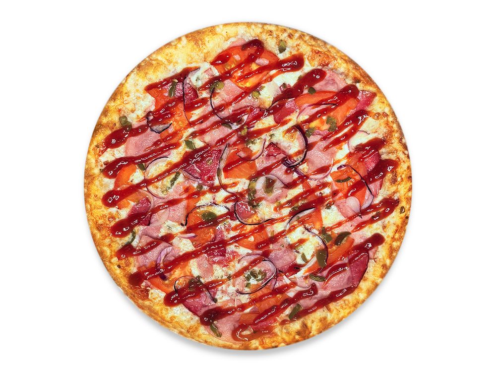 Соус сальса, сыр моцарелла, ветчина, салями, бекон, помидоры, красный лук, халапеньо, укроп