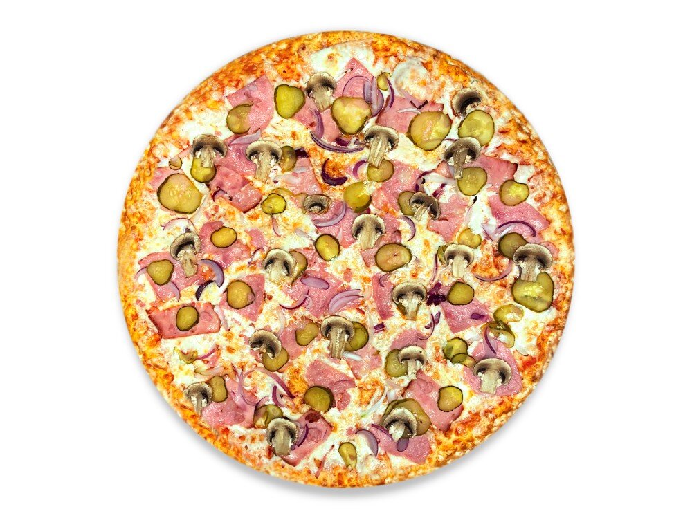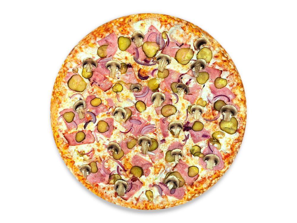 Фирменный томатный соус, сыр моцарелла, ветчина, грибы шампиньоны, бекон, маринованные огурчики, лук красный