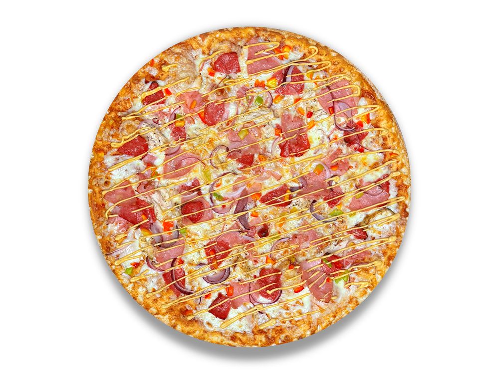 Соус барбекю, сыр моцарелла, салями, куриная грудка, нежный бекон, ветчина, сладкий перец, лук красный, соус гриль