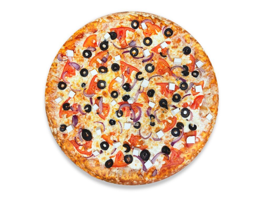 Фирменный томатный соус, сыр моцарелла, свежие томаты, лук красный, маслины, сыр фетаки, итальянские травы