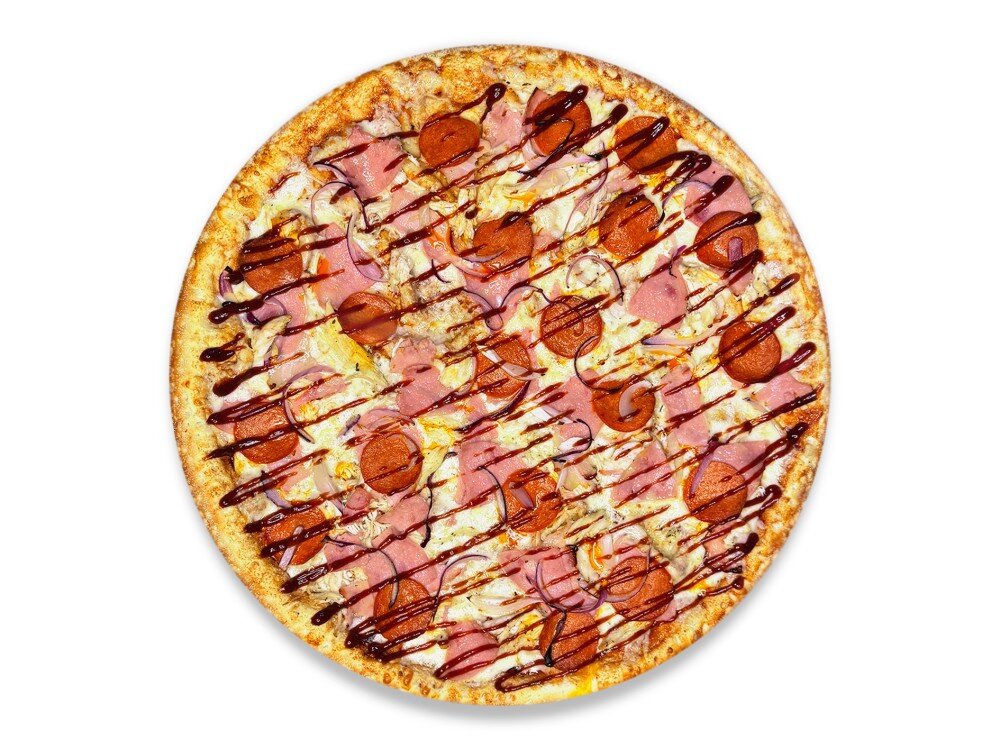 Соус барбекю, сыр моцарелла, ветчина, куриная грудка, бекон, пепперони, красный лук
