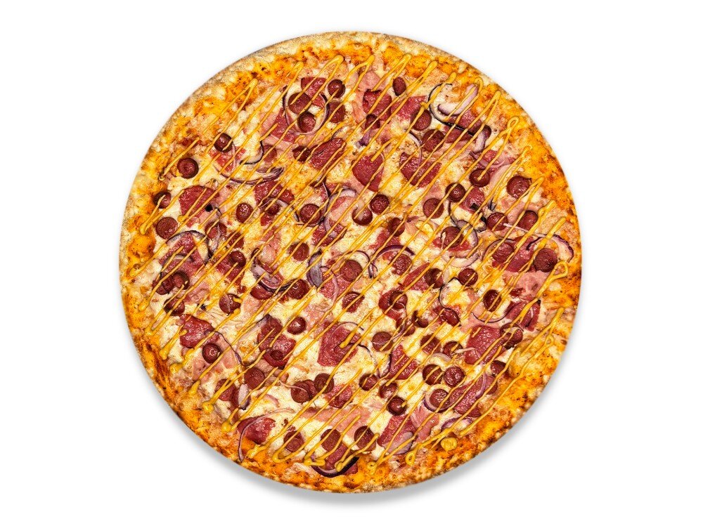 Фирменный томатный соус, сыр моцарелла, колбаски охотничьи, бекон, салями, красный лук, соус гриль